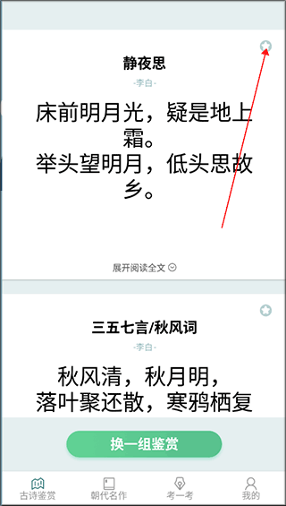 1、下载安装好多多高手app,进入软件点击故事鉴赏,可以观看许多的古诗并且点击右上角的五角星标志可以进行收藏。