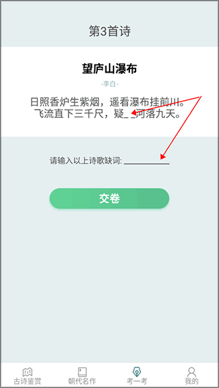 3、点击考一考可以进行古诗的答题,你需要输入正确的词。
