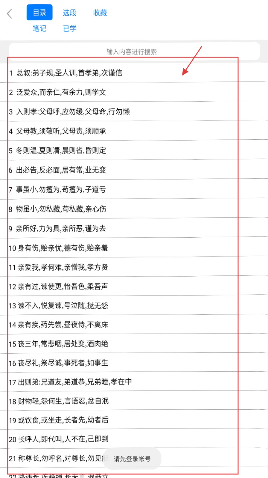 2、在《弟子规》目录,选具体章节,如“入则孝”,进入学习或默写环节。