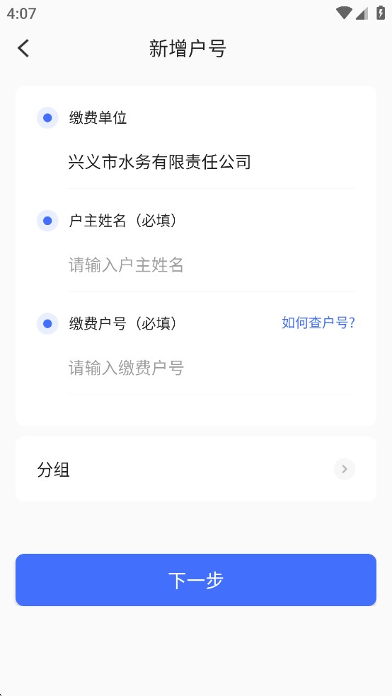 4、输入具体的户号信息后,点击【下一步】