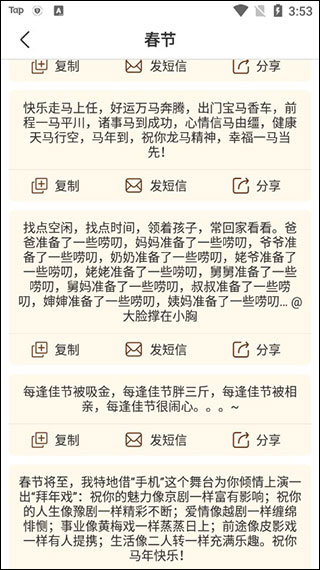 3.一键发送:点击祝福语,直接跳转短信/微信/QQ等第三方应用发送。