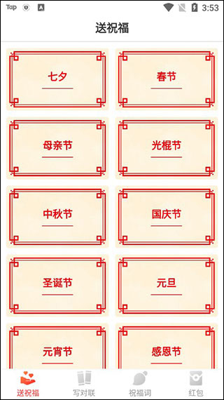 2.浏览祝福语:首页分类展示春节、中秋等各大节日祝福语,按需选择。