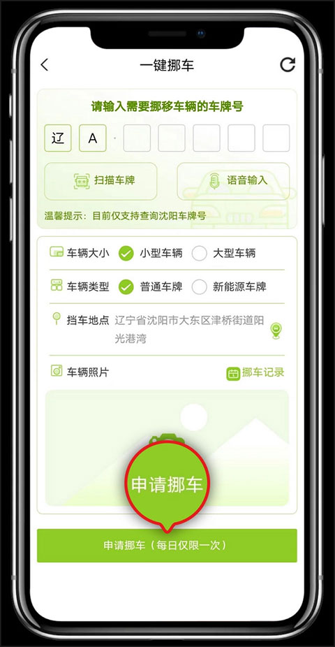 4、填写需要挪移车辆的车牌号,可选择手动输入、扫描车牌或语音识别输入,点选车辆大小、类型,上传车辆照片,点击“申请挪车”