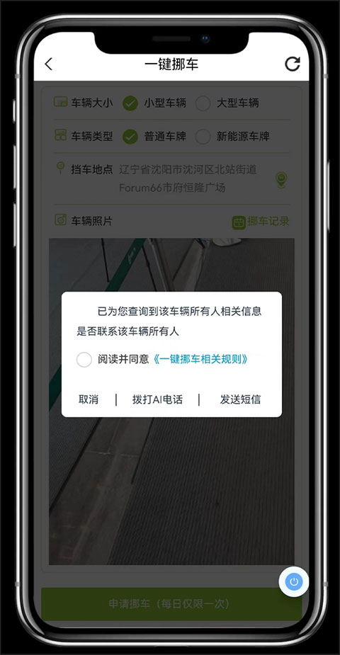 5、根据需要选择“拨打AI电话”或“发送短信”系统将通知阻挡车辆的车主前来挪车