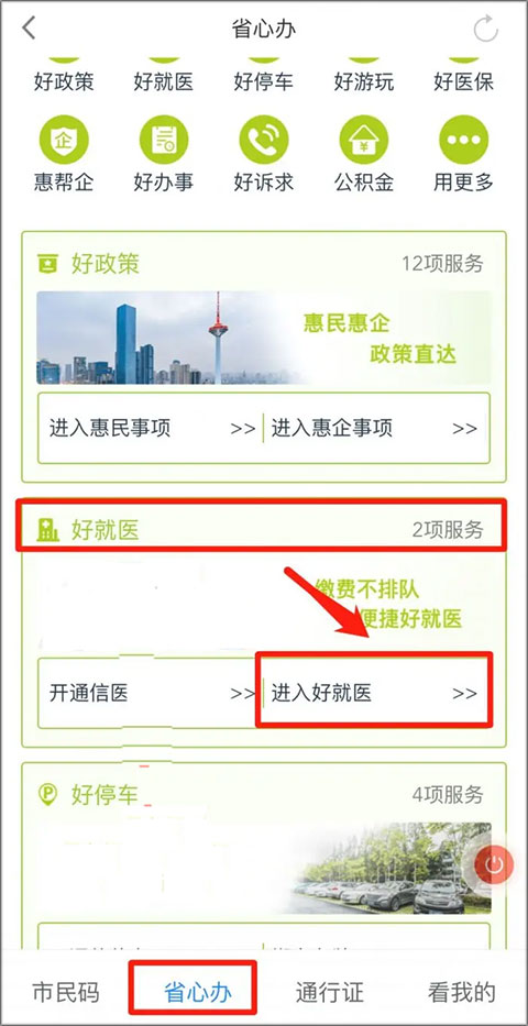 1、下载安装并打开盛事通ios版,按照提示完成实名认证,点击底部菜单栏“省心办”,在“好就医”板块点击“进入好就医”;