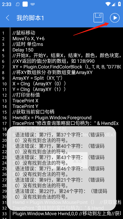 5、下面小编在网上随便找了一个游戏开挂脚本代码,写完代码之后点击右上角的运行。