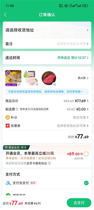 4、最后输入收货地址支付即可【可看到送达时间和预约配送】