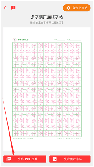 3、选择完成后,点击右上角的“自定义字帖”可以对字帖进行设置;