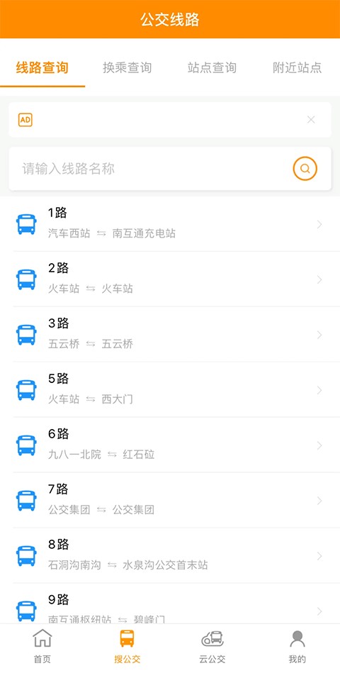 在首页搜索框输入 线路名称(如“1路”),下方显示该线路的起始站信息。