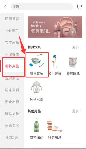 4.筛选商品:在分类列表中选择“喂养用品”,查看餐具套装等具体商品详情。