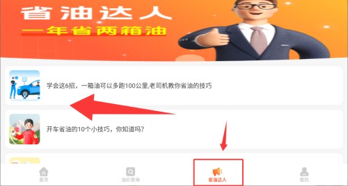 切换至“省油达人”板块,浏览图文或视频教程,掌握实用节油方法(如合理胎压、匀速驾驶等)。
