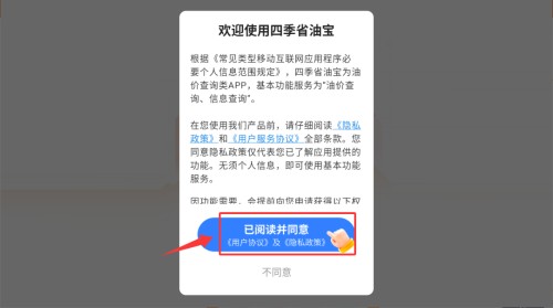 首次打开四季省油宝App,点击使用提示弹窗中的“已阅读并同意”进入主界面。