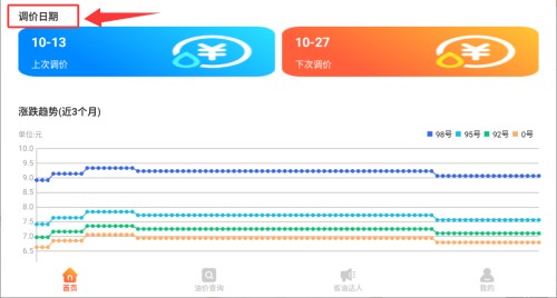 进入油价详情页,可查看调价时间及近三个月的价格走势图,了解油价波动规律。