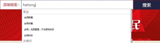 (1)快捷检索支持关键词联想推荐。在快捷检索框中输入关键词后,联想推荐案由、关键词、审理法院、当事人、审理人员、律师、律所、法律依据八个类型的信息。