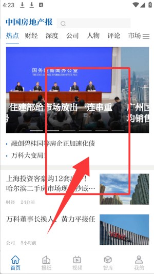 打开App后,优先查看顶部导航栏或首页的分类标签(如政策、市场、房企、土地等)。