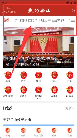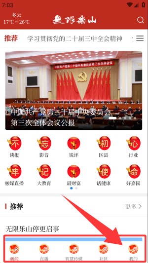 打开App后,第一时间查看顶部或侧边的分类标签(如新闻、活动、便民服务等)。