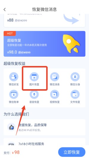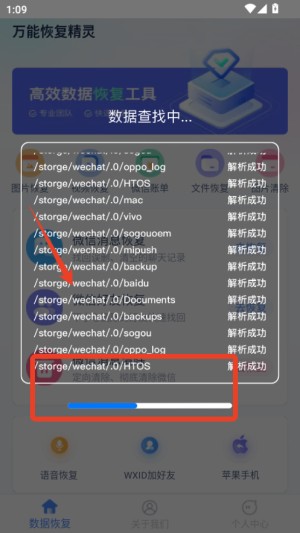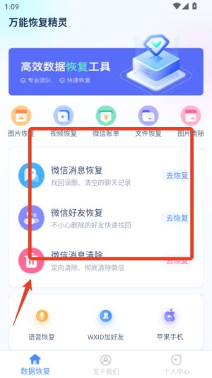 打开软件后,根据需求点击对应功能模块(如图片恢复、微信账单恢复等),进入扫描界面。