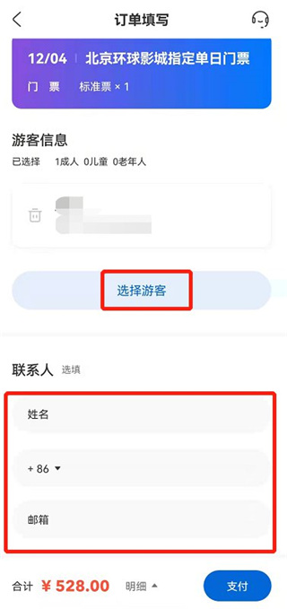 3.填信息付款:选或添加游客信息(姓名、身份证号),填联系人信息,支付订单就购票成功啦。