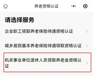 步骤1:选择【机关事业单位退休人员领取养老金资格认证】。