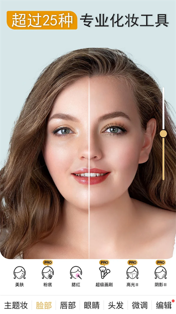 4.应用妆容:从25款主题妆容中选择(如自然妆、舞台妆),或自定义调整参数(眼影、唇彩、腮红等细节)。