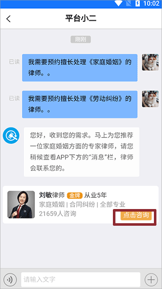 2、匹配律师:根据您的提问类型,系统自动匹配相关专业律师为你服务