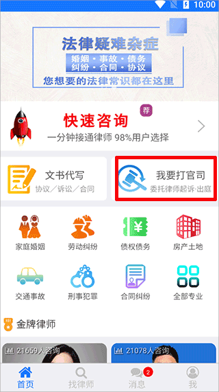 1、打开律师堂app,在首页找到并点击“我要打官司”按键;