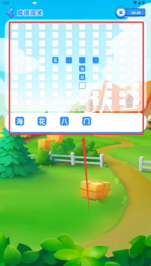进入答题页后,从下方文字池中选中正确汉字,拖拽到空格完成成语填空。