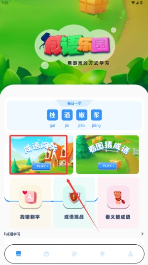 打开App,在首页找到“成语挑战”入口,点击进入关卡页面。