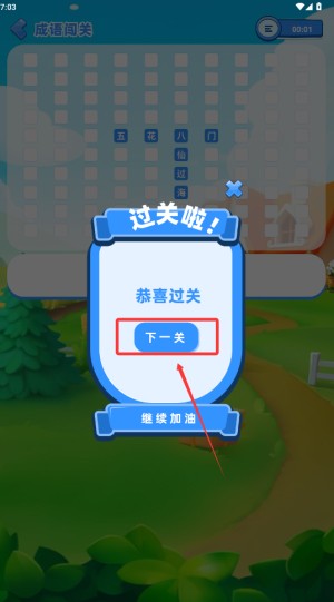 答题正确会弹出“恭喜过关”提示,点击“下一关”即可解锁新关卡,挑战更多成语!