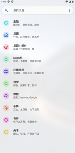 图标与网格:支持自定义图标包、图标形状、大小及网格布局,用户可自由调整桌面密度与视觉风格。