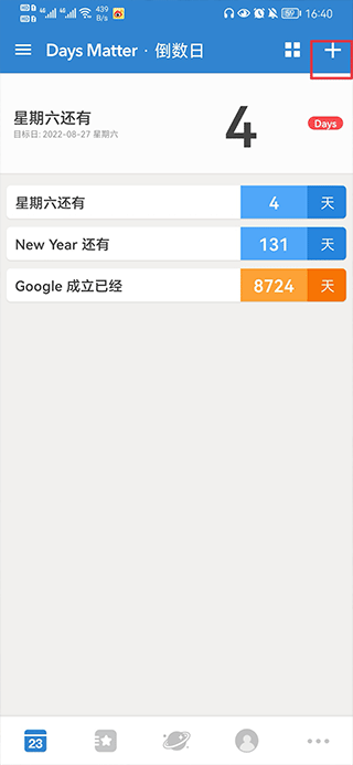 1、打开倒数日app,在首页中点击右上角+号
