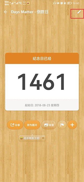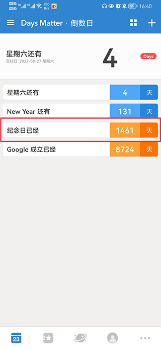 2、选择好过去的时间后保存,就可以在首页看到正计时了,倒计时为蓝色、正计时为橙色。