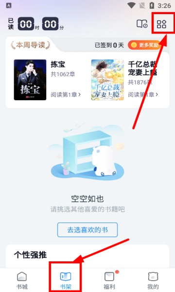 1.打开 app,在首页底部点【书架】,再点右上角图标;
