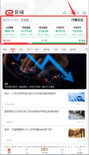 3.最后在主界面上,你就能轻松查看上证指数、深证成指等各类行情数据与资讯啦。
