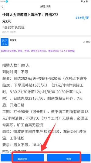 3.最后,点开感兴趣的职位查看详细信息,能直接通过电话沟通,或者添加微信联系招聘企业。