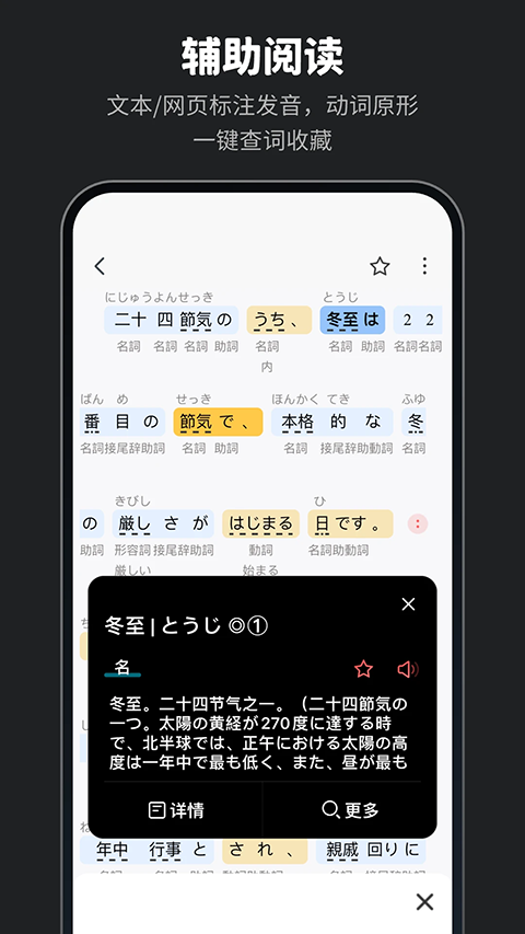 1、权威词典支持,内置雅虎日本、大辞泉等权威词典,提供标准发音音频和详细释义,支持中日英三语快速精准搜索。