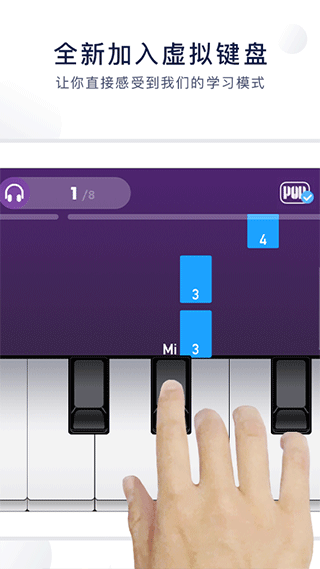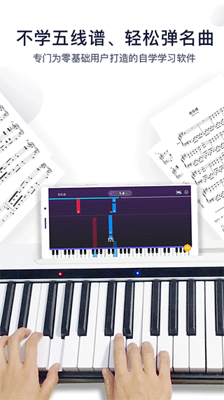 1、颠覆传统学琴模式,独创瀑布流音符提示,将抽象乐理转化为直观视觉引导,通过数字(1-5对应手指)和灯光提示即可弹奏,