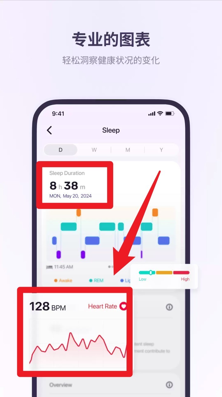 1.打开 App,进 Sleep 页面,能看到前一晚总睡眠时长、各阶段分布,下拉还能看心率变化曲线。