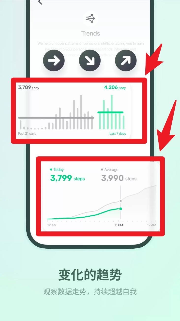 2.点 Trends 标签页,浏览 7 到 21 天运动趋势图,清楚每日步数变化及与平均步数对比情况。