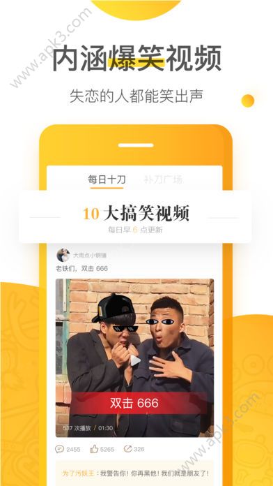 补刀小视频是一款手机短视频软件,视频回贴,美女小视频、精选搞笑段子等内容,亮瞎你的双眼,你想看的视频平台将会强烈为你推荐,包含爆笑短视频,喜欢的朋友们快来玩客网下载体验吧!