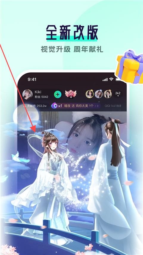 1、炫酷特效与趣味玩法,支持观看直播同时参与游戏,如抽奖、答题等,提供独特身份标识和虚拟座驾。
