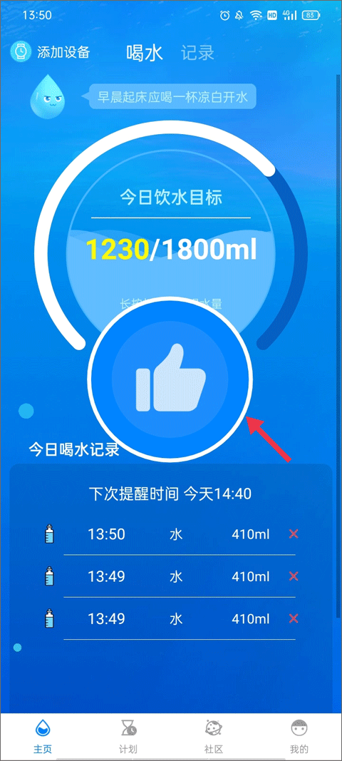 1、还是在【主页】这个板块,点击页面杯型下方的“+”,这时中间会弹出一个巨大的点赞图标,今日饮水目标也会不断加满。
