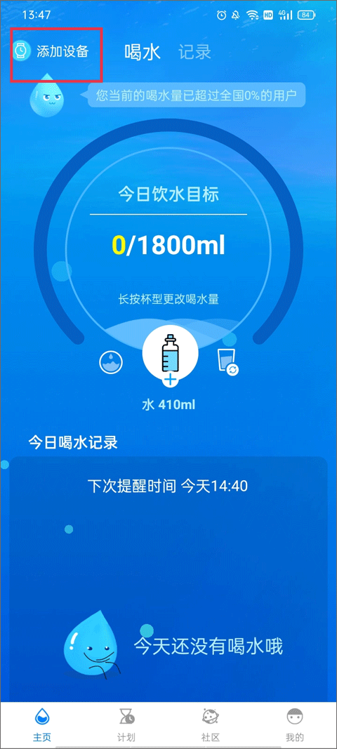 1、打开app并进入到【主页】,根据上方的文字提示长按杯型就能更改喝水量。