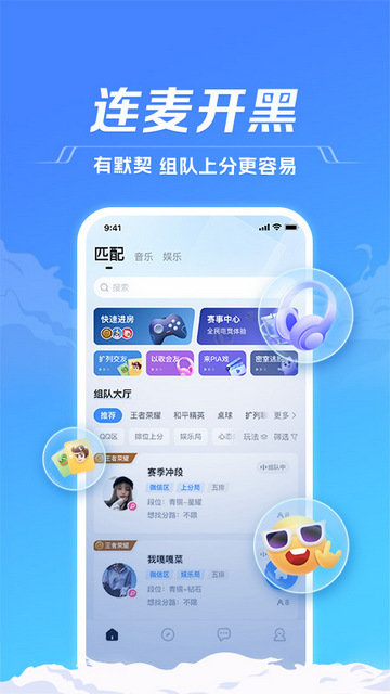 有默契,上分更容易,快速组局,集结开黑小队,个性游戏卡片,精准匹配游戏房间有默契队友助攻,上分更轻松。