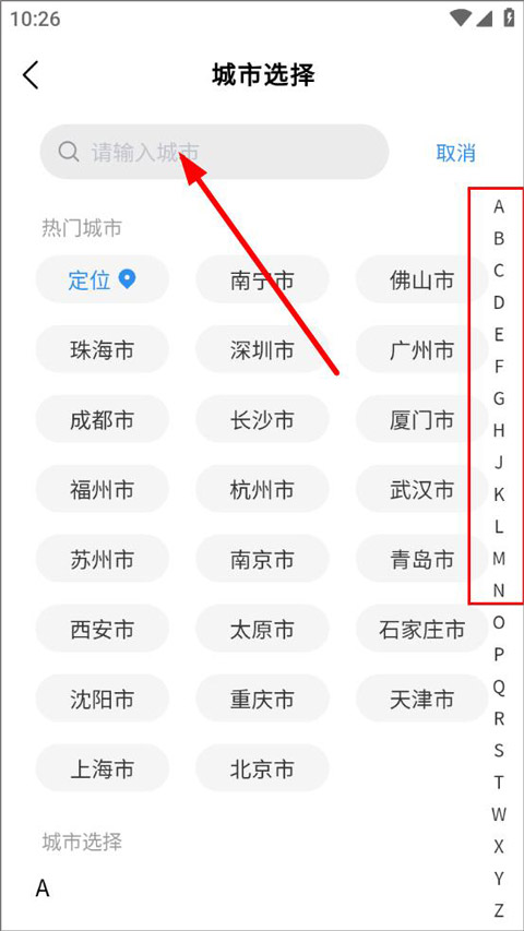 3、城市选择页面可以看到热门城市以及当前定位,用户可在搜索框输入城市查询,也可在右侧按照城市首字母搜索;