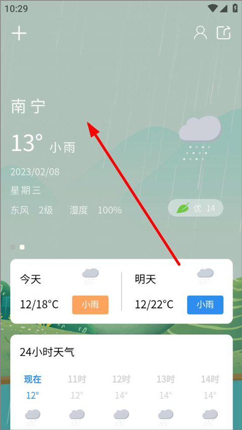 1、打开app,进入主页,主页可查询当前城市天气、温度、湿度以及24小时天气、15日天气趋势,点击左上角“+”;