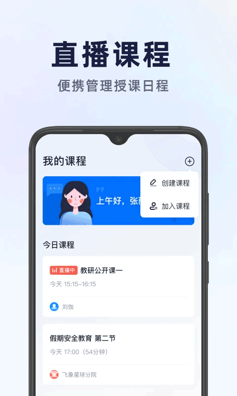 2、全场景在线教学工具,可一键创建班级,邀请科任老师和学生加入,实时发布通知、课程表,并查看学生考勤与学习进度。