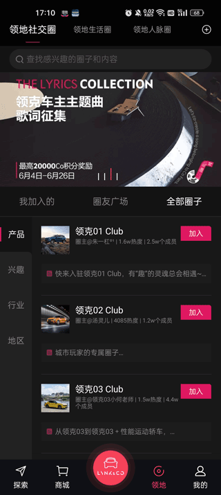 5、点开领地,显示的是各种的领克车主的社交圈、生活圈、人脉圈等,加入车友圈找到与不同的车主进行交流。