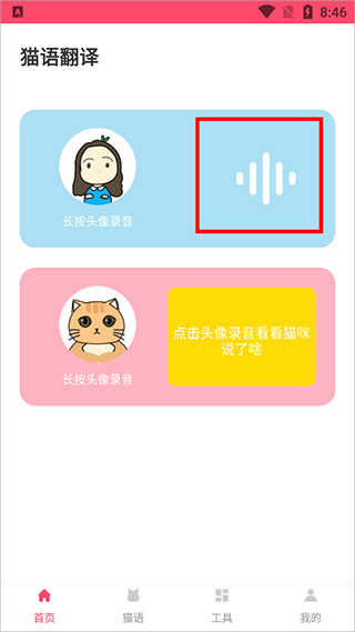 1、用户进入应用后就可以长按首页中的猫咪头像进行录音