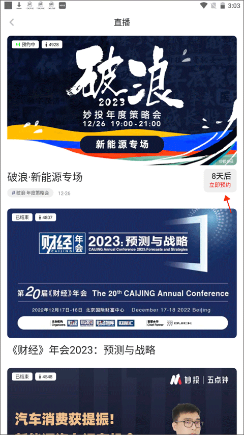 2、页面上显示了很多已经结束的直播,选择你要预约的直播并点击“立即预约”。